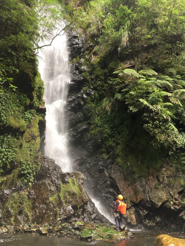 Geba Waterfall(戈霸瀑布)24.68408,121.57433. There is another waterfall further up, and the distance to it is said to be 1 hour from Geba Waterfall. The trail goes to Geba Waterfall from the entrance. This creek is in Jiuliao River Ecological Park, and river tracing is not allowed. There is a chance to get driven away by the patrols.