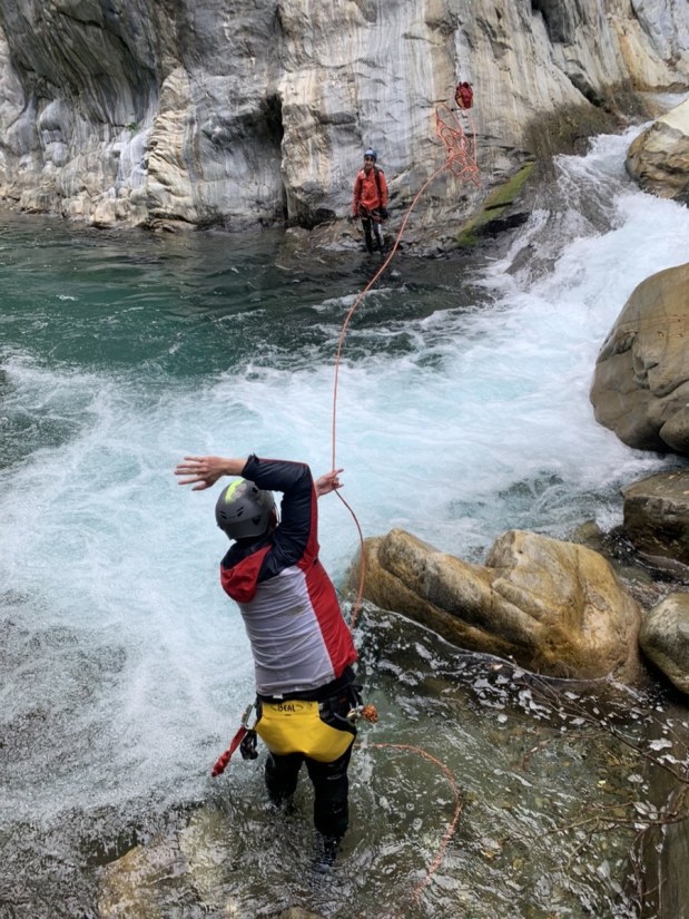 Life jackets, helmets, river tracing boots, and a throwing bag.