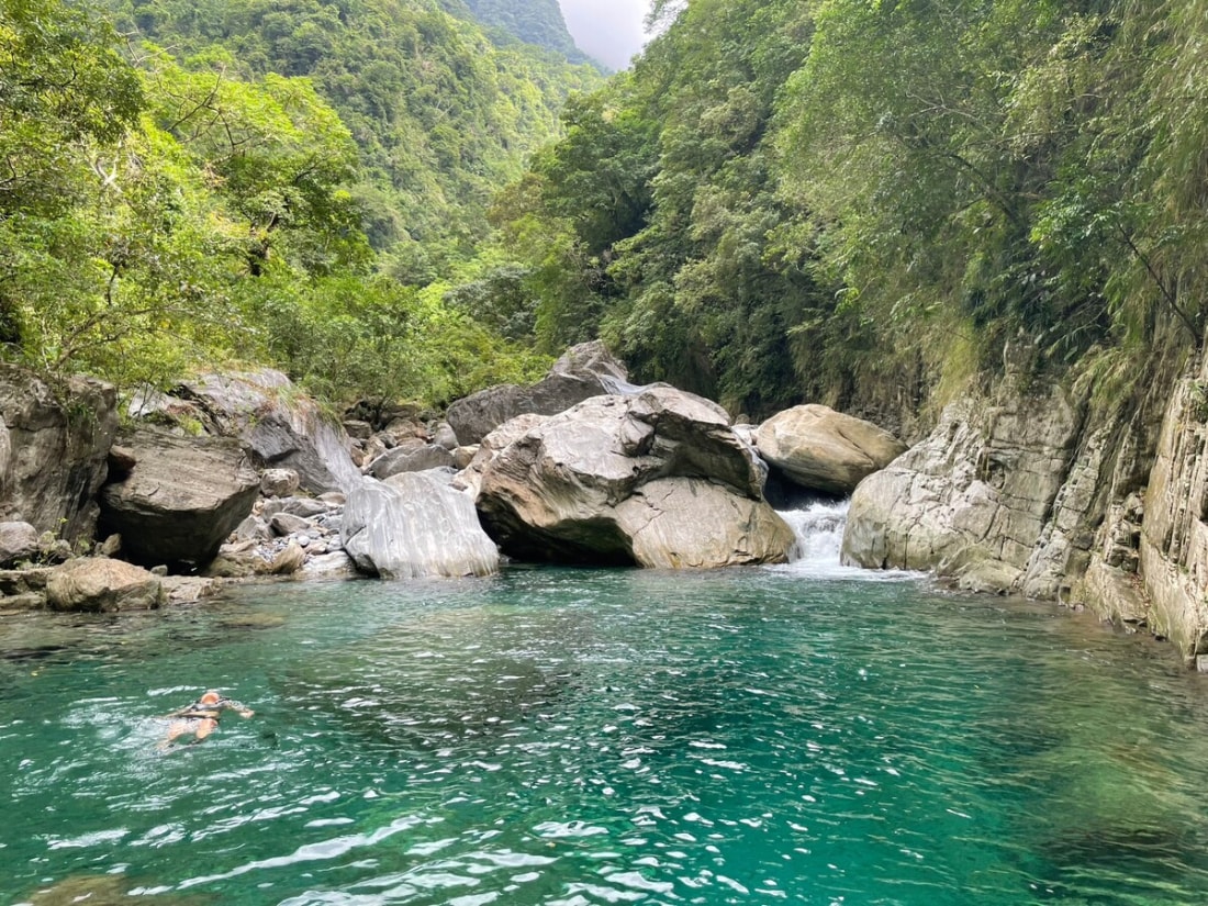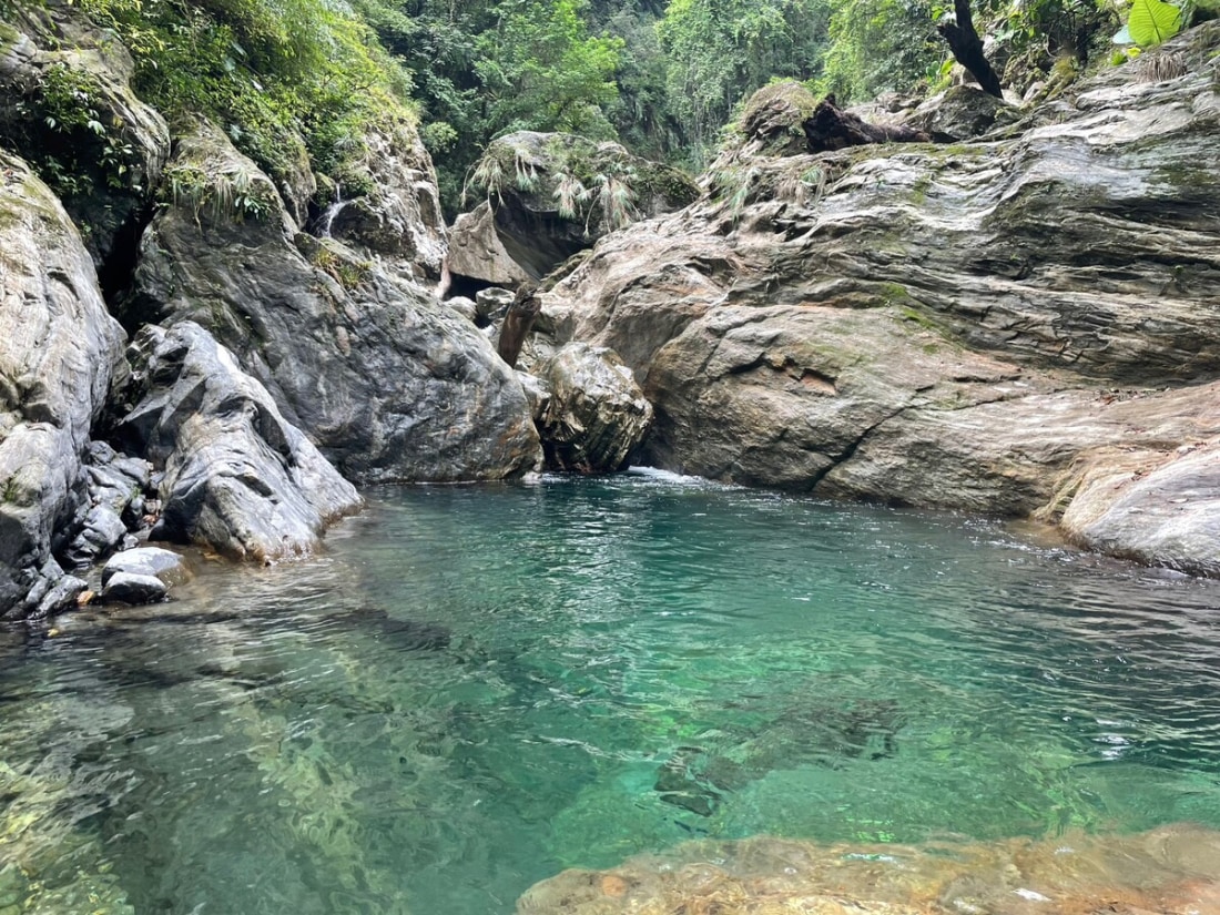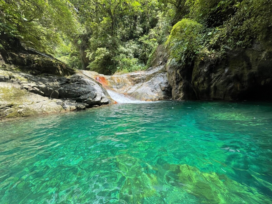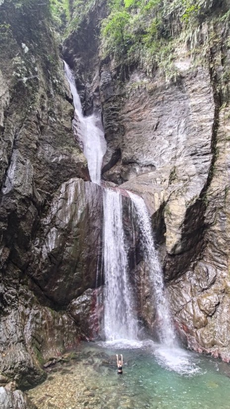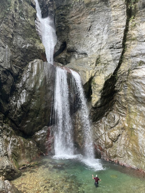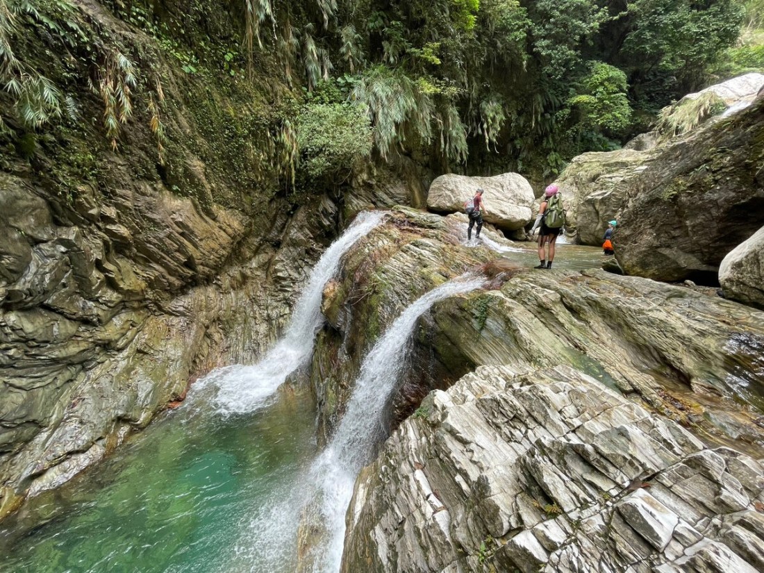 The 5-kilometer one-way hike was quite long. We walked almost non-stop and chose to stick to the trail as much as possible while strictly limiting our time to 5 or 10 minutes at each large pool. To save time, we followed the trail for most of the route to Double Dragon Waterfall rather than tracing in the water. From Double Dragon to the final 120-meter waterfall, the creek became steeper and more challenging, requiring us to climb large rocks, which slowed us down. There were no technical difficulties, but it demanded physical stamina and strict time management. We spent a fair amount of time at each large pool, but we decided to skip the Double Dragon pool and its slide. On our way back, we jumped into the pools (having checked their depth and suitable jump spots on our way up). We passed all the commercial tours and were rewarded with the opportunity to filter and drink the creek water, which tasted great. Most of them only reached the first large pool, and only a few made it to Crimson Gorge. Before reaching the final waterfall, we encountered a slender and elegant 60-meter waterfall and another tall one. Then came the enormous final 120-meter waterfall. It deserved a spot in my top ten magnificent waterfalls list, alongside the 120-meter Nenggao Soaring Falls. I had initially thought it would be around 70 meters based on the topo map, but I was glad to be proven wrong—very wrong. The waterfall consisted of three tiers, resembling the cross-section of a pork belly. The creek water from the main stream rushed from the top of the waterfall to the next tier, then further down to another tier before finally reaching the enormous pool it had created. The waterfall gorge had a beautiful shape, surrounded by steep mountainsides. A giant boulder served as the waterfall's threshold, which we had to climb over to access the pool, accompanied by a secondary 10-meter waterfall between the boulder itself and the giant pool. This trace was one of the most enjoyable and rewarding experiences I've had so far. It appears that there was another waterfall over 100 meters high about 300 meters away. Hopefully, someone can bring a drone to check it out. Trailhead 24.10787,121.59976 Rose Valley 玫瑰谷 24.11162,121.59199 Crimson Valley 赤金峽谷 24.11639,121.58093 Double Dragon 雙龍瀑布 24.11679,121.57702 Gorge 24.11692,121.57491 120-M Pork Belly Waterfall 24.12026,121.57353