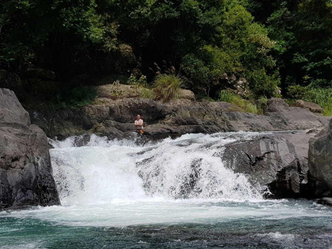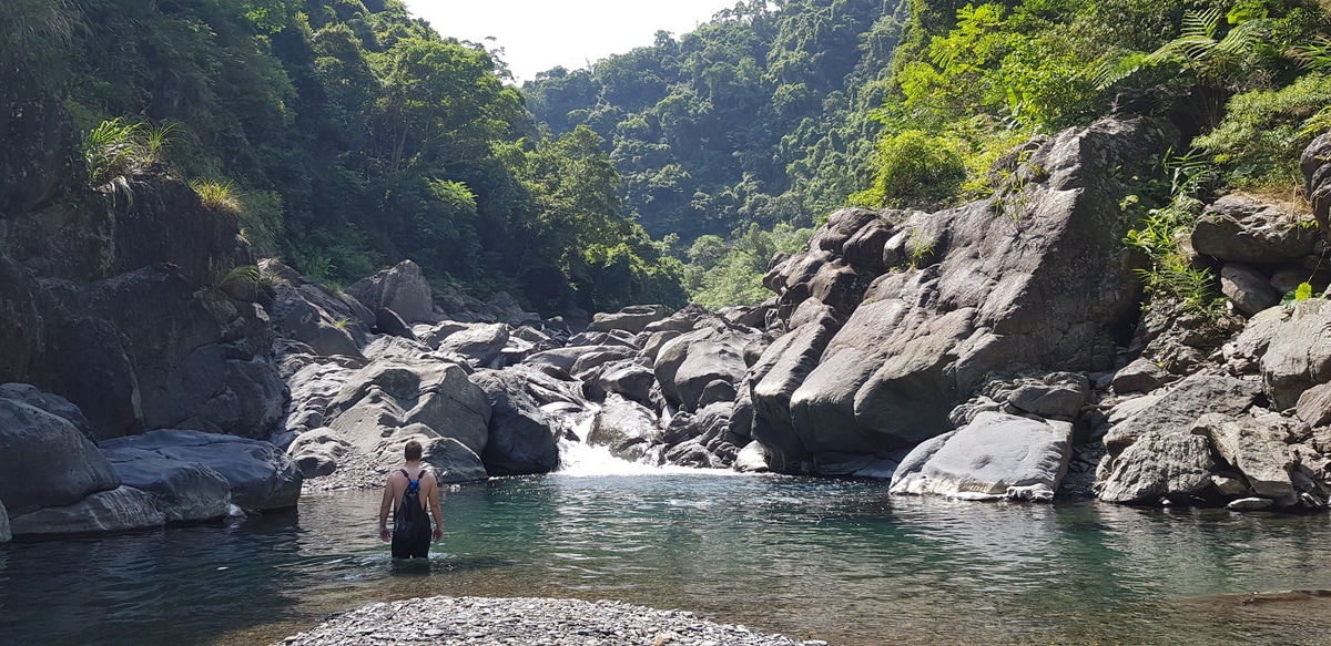 This is a very simple trace just south of the town in Wulai. The starting point is behind the blue pieces of sheet metal along the road, and there is a path behind them that leads to the the stream. It would be best for you to start here instead of by the elementary school because it is very easy to miss the exit. Depending on the water level, this trace can be categorized as easy to medium. Along the trace there are numerous pools to swim in.