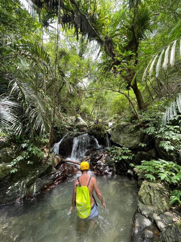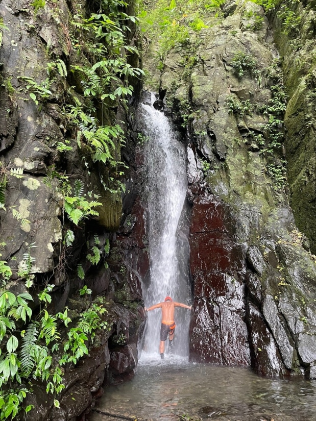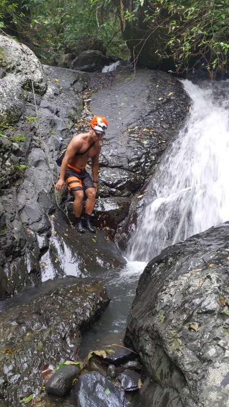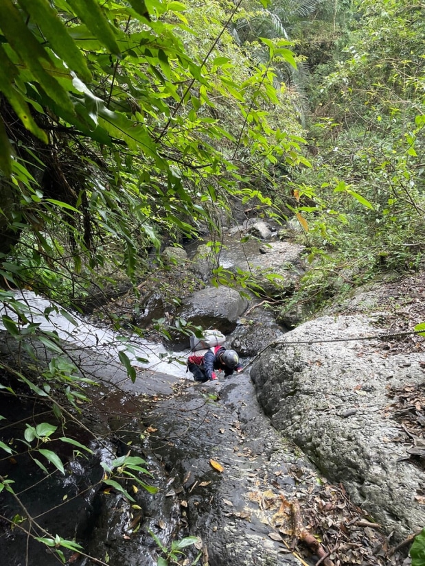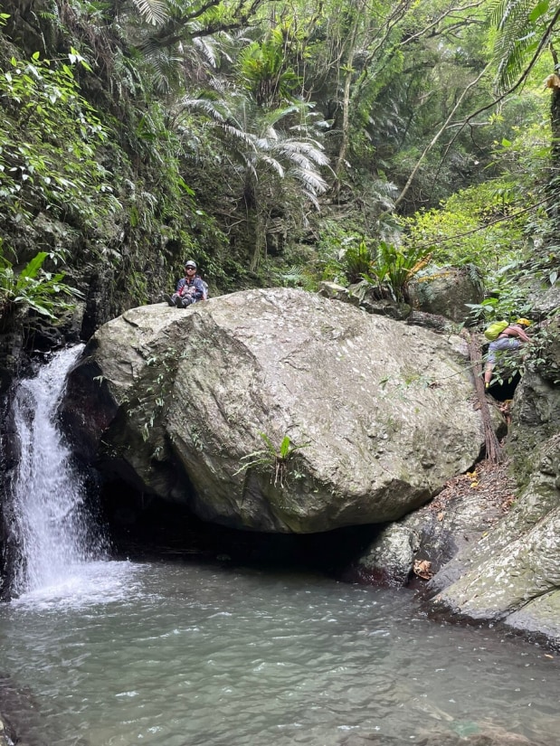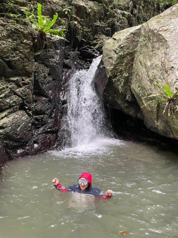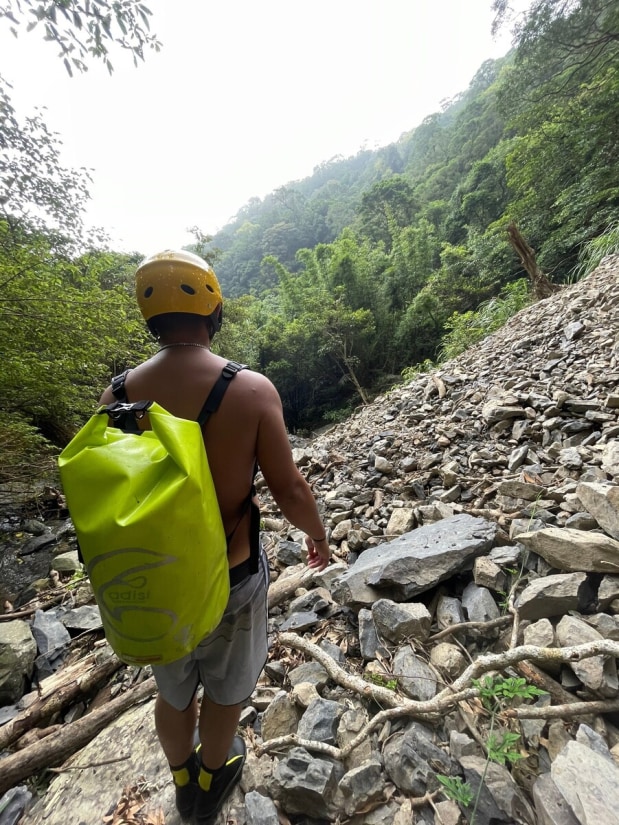 The creek is short, but the trek took us more time than expected. We planned to finish it in about 2 hours, but surprisingly, it took 4 hours. The creek is full of shrimp, and we spent quite a bit of time watching them. There was also some climbing along the creek. We encountered the first small waterfall/obstacle just dozens of meters from where we entered the water. It was about 3 meters high. I carefully climbed up and found a rope lying at the top, which then I threw down for the others. The rope seemed to have been there for over a decade. Climbing down would have been nearly impossible without it. Then, we entered a small gorge with a large boulder blocking the creek, forming a very small waterfall about 2.5 meters high, just barely qualifying as one. This "waterfall" pool was the only spot where we could fully soak ourselves. After about 50 minutes of tracing the creek, we reached the main waterfall. It was in the right fork, and there was a massive landslide just 10 meters away from it. The strong flow of water poured down from this 10-meter waterfall (but keep in mind, this was a week after a typhoon). We took pictures, enjoyed the natural spa, and had our lunch there. We did this trace a week after a typhoon and the water flow was satisfying. I can imagine how dry the creek could be during a dry period. In general, creeks in Toucheng are often a good choice after heavy rain.