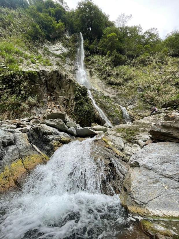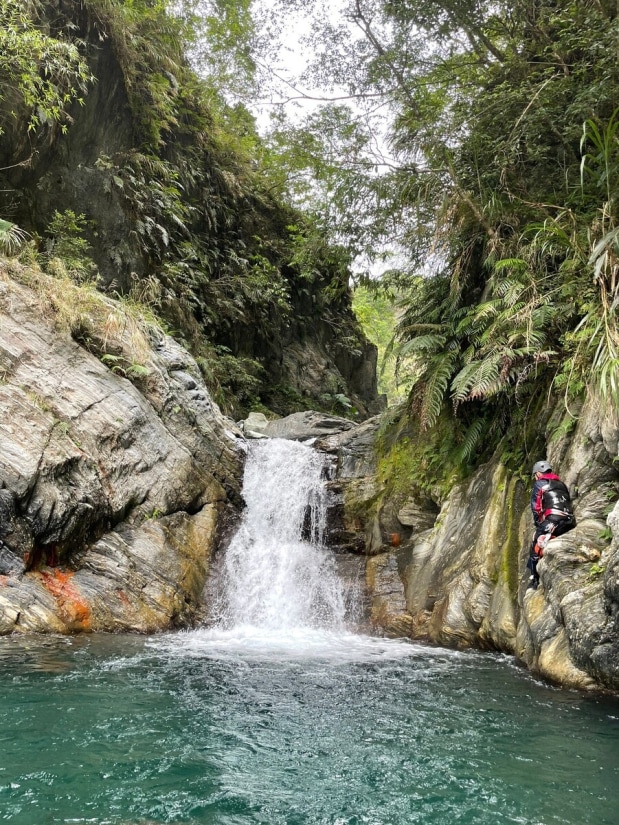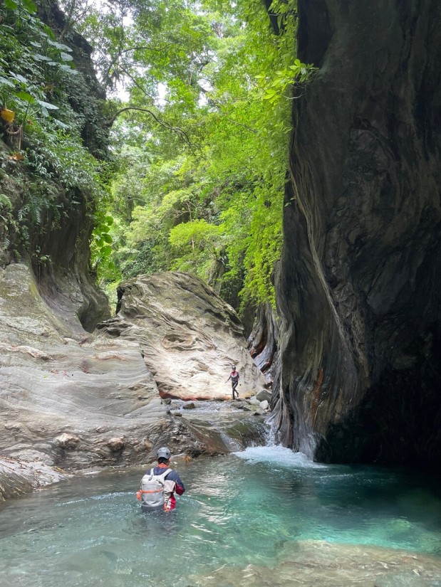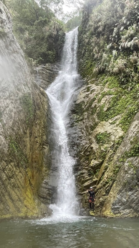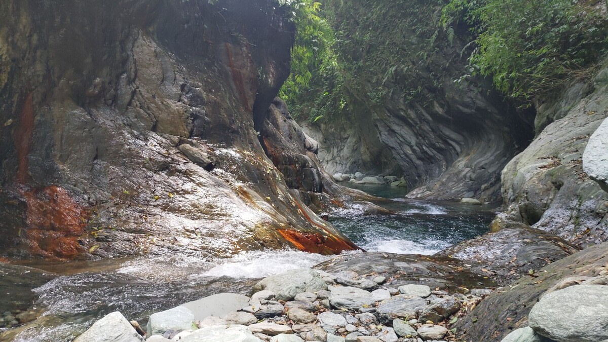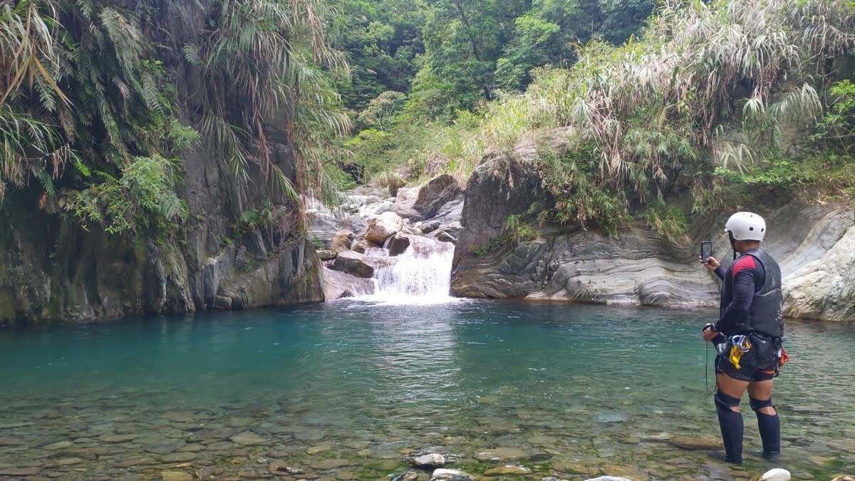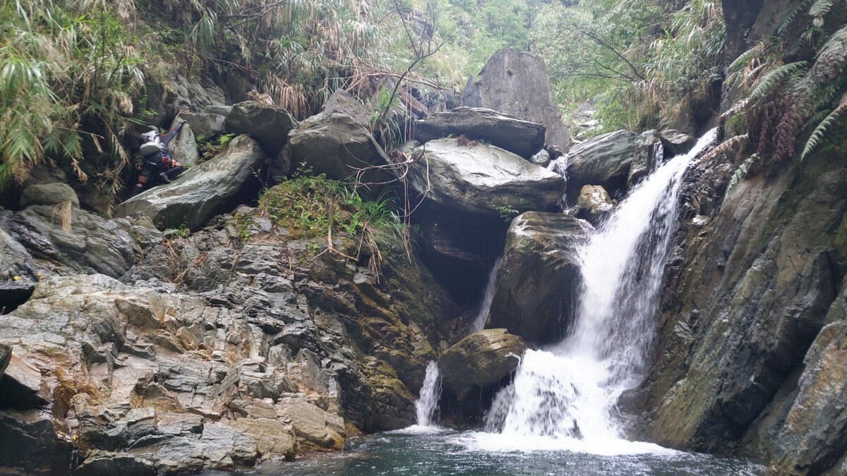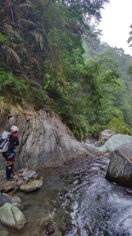 Most people visit only the entrance area of this creek, where the famous gorge of Bidan is located. Bidan gorge, with its red brown stripes, looks like the small version of Hayou River. And the gate to Bidan gorge's hallway(not at the fork of the big creek, a bit farther) resembles to the one in Melberry Creek. Tracing in this section of the creek usually takes only 1–2 hours at most, but it's quite beautiful. We traced all the way up to the final marked spot. Along the way, we passed two pools and their small waterfalls. The first pool was large and clean. We climbed along the edge of its small waterfall on the left side (facing downstream), which was not too difficult. The second pool, however, was more challenging. We climbed up on the left side (facing downstream) and set up a rope to descend onto the top of the waterfall. We left the rope there for our return. Soon, we saw the first tall waterfall, about 50 meters high, with a gentle flow. The creek split there, and we took the left fork (facing upstream). The terrain grew steeper, and we did quite a bit of climbing—very different from the flatter section before. The final climb up to the waterfall was a bit tricky due to unstable rock plates (I cut my finger on silver grass while climbing down). Finally, we reached the last waterfall, which had a unique shape and a beautiful pool. Overall, the trace was enjoyable and not particularly difficult for experienced tracers.