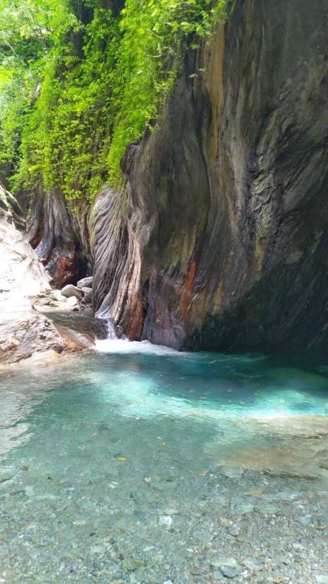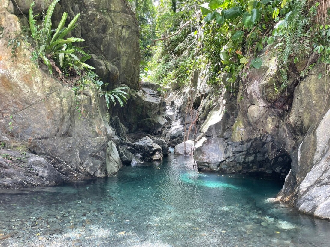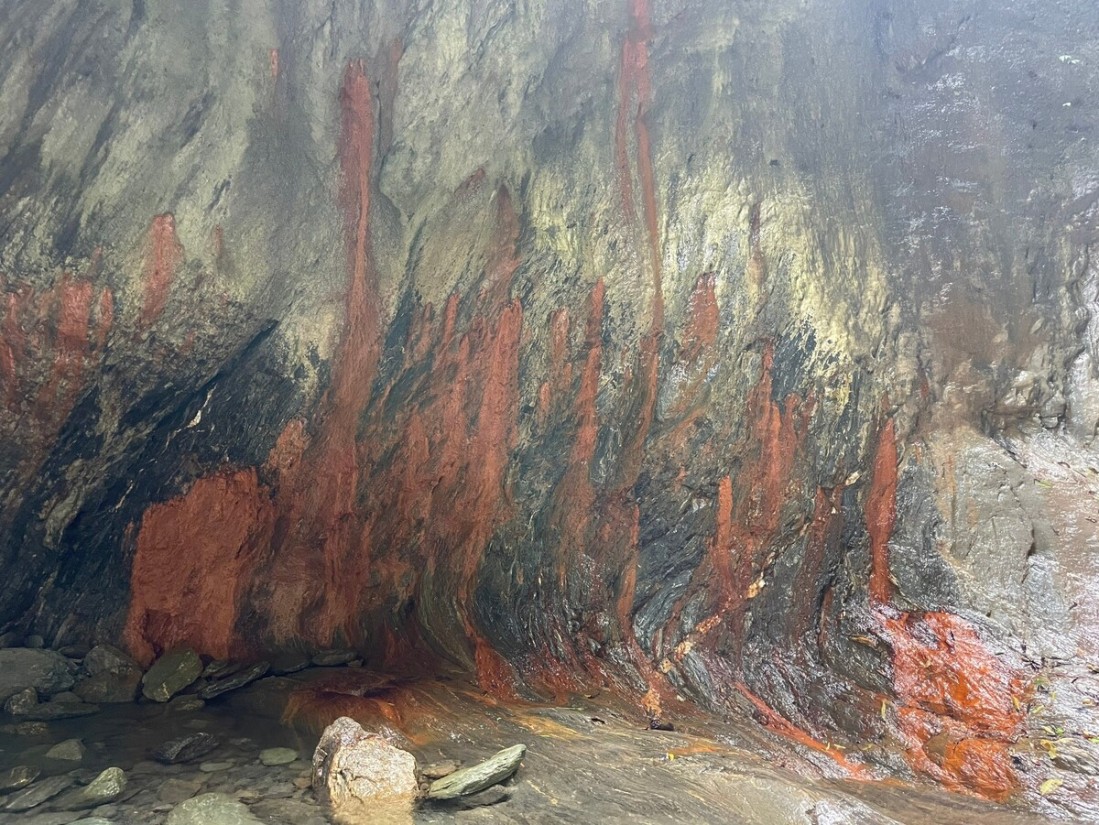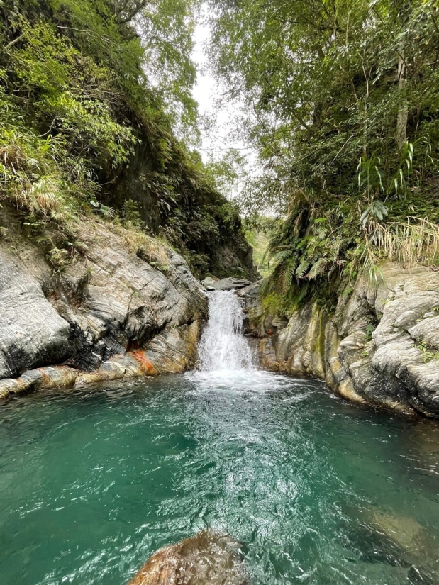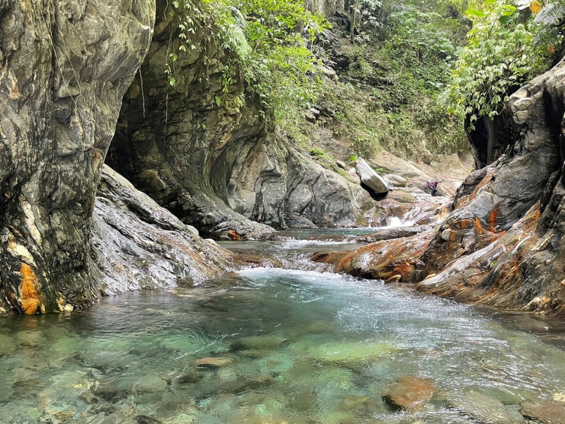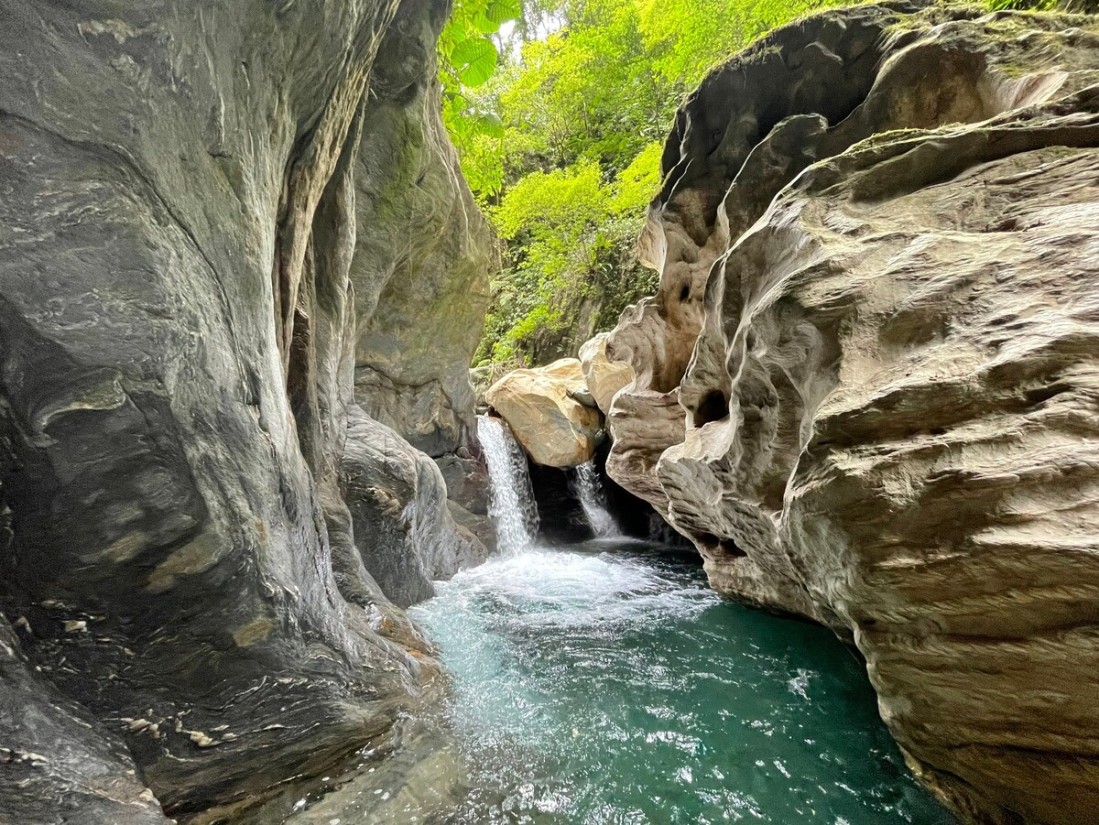 Most people visit only the entrance area of this creek, where the famous gorge of Bidan is located. Bidan gorge, with its red brown stripes, looks like the small version of Hayou River. And the gate to Bidan gorge's hallway(not at the fork of the big creek, a bit farther) resembles to the one in Melberry Creek. Tracing in this section of the creek usually takes only 1–2 hours at most, but it's quite beautiful. We traced all the way up to the final marked spot. Along the way, we passed two pools and their small waterfalls. The first pool was large and clean. We climbed along the edge of its small waterfall on the left side (facing downstream), which was not too difficult. The second pool, however, was more challenging. We climbed up on the left side (facing downstream) and set up a rope to descend onto the top of the waterfall. We left the rope there for our return. Soon, we saw the first tall waterfall, about 50 meters high, with a gentle flow. The creek split there, and we took the left fork (facing upstream). The terrain grew steeper, and we did quite a bit of climbing—very different from the flatter section before. The final climb up to the waterfall was a bit tricky due to unstable rock plates (I cut my finger on silver grass while climbing down). Finally, we reached the last waterfall, which had a unique shape and a beautiful pool. Overall, the trace was enjoyable and not particularly difficult for experienced tracers.