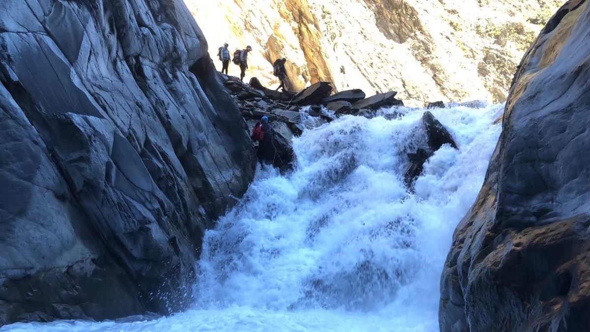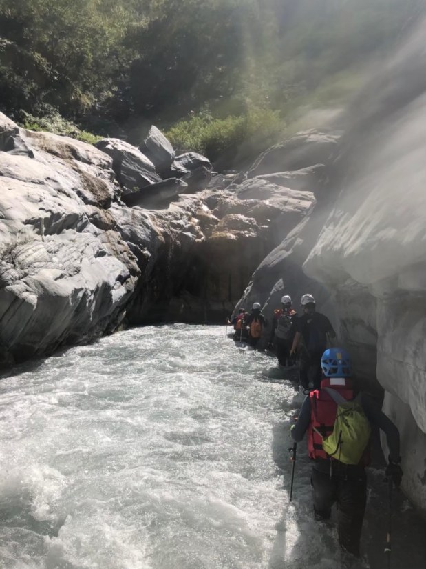 Helmets, life jackets, river tracing boots, harness, trekking gear, throw bag.
